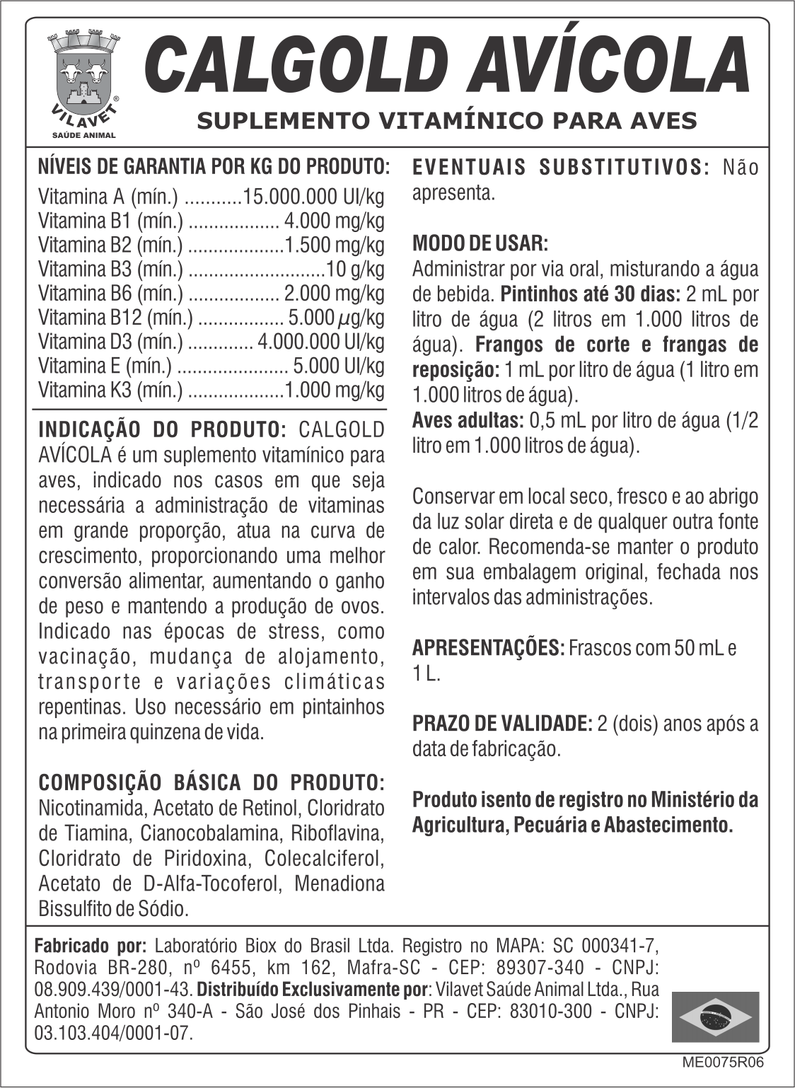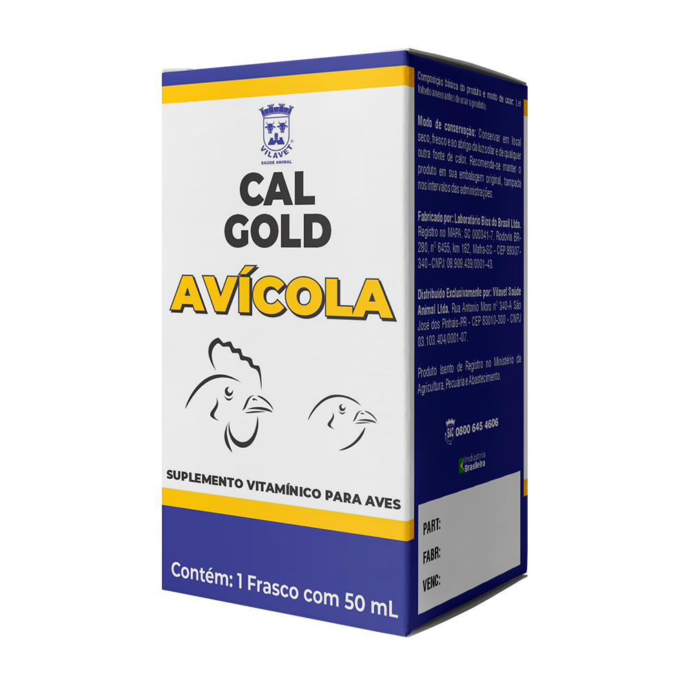 CALGOLD AVÍCOLA é um suplemento vitamínico para aves, indicado nos casos em que seja necessária a administração de vitaminas em grande proporção, atua na curva de crescimento, proporcionando uma melhor conversão alimentar, aumentando o ganho de peso e mantendo a produção de ovos. Indicado nas épocas de estresse, vacinação, mudança de alojamento, transporte e variações climáticas repentinas. Uso necessário em pintainhos na primeira quinzena de vida.