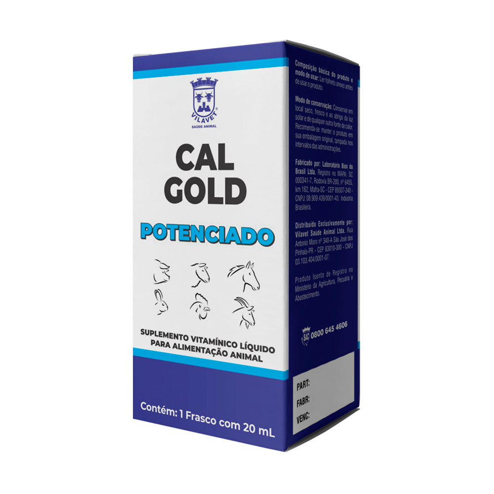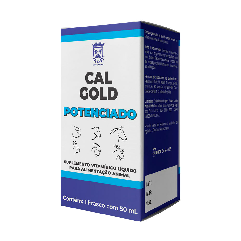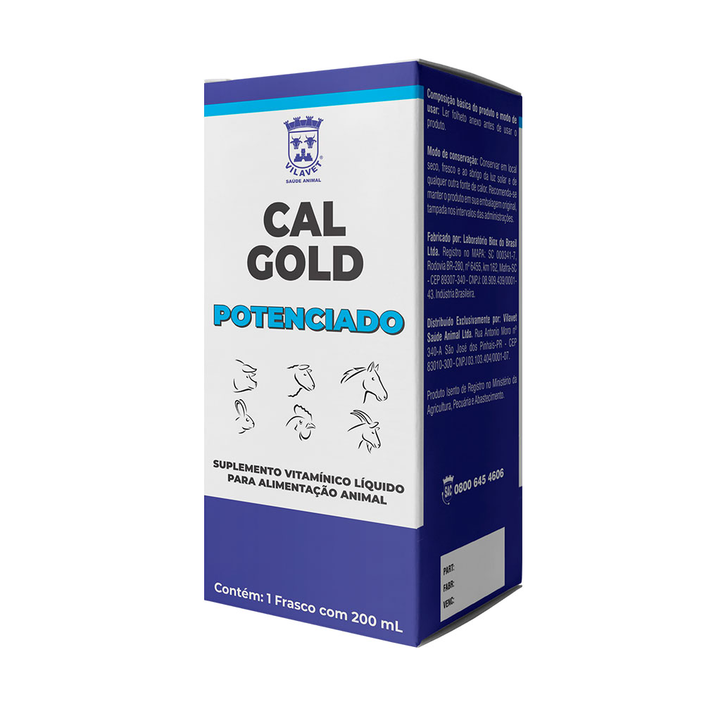 Indicação: CALGOLD POTENCIADO é um suplemento vitamínico líquido para alimentação animal, indicado para suínos, equinos, ovinos, caprinos, aves e coelhos. Auxilia nos casos de carências de vitaminas, no processo de crescimento, adiciona fatores importantes à alimentação normal, acrescenta reservas ao organismo nos períodos de estresse provocados por causas como: aumento rápido da produção leiteira, na postura, na mudança de níveis alimentares, em épocas de vacinação e vermifugação.