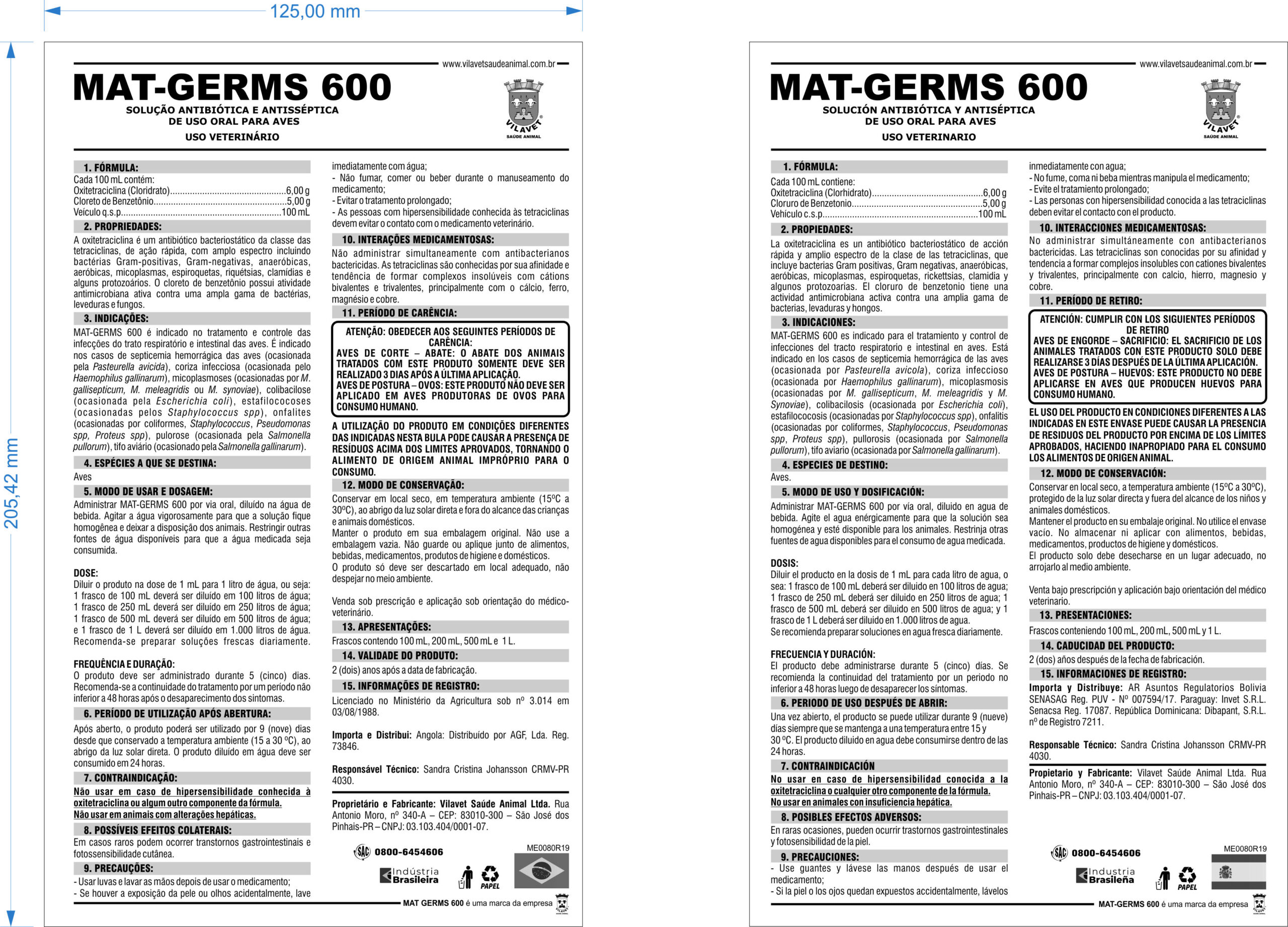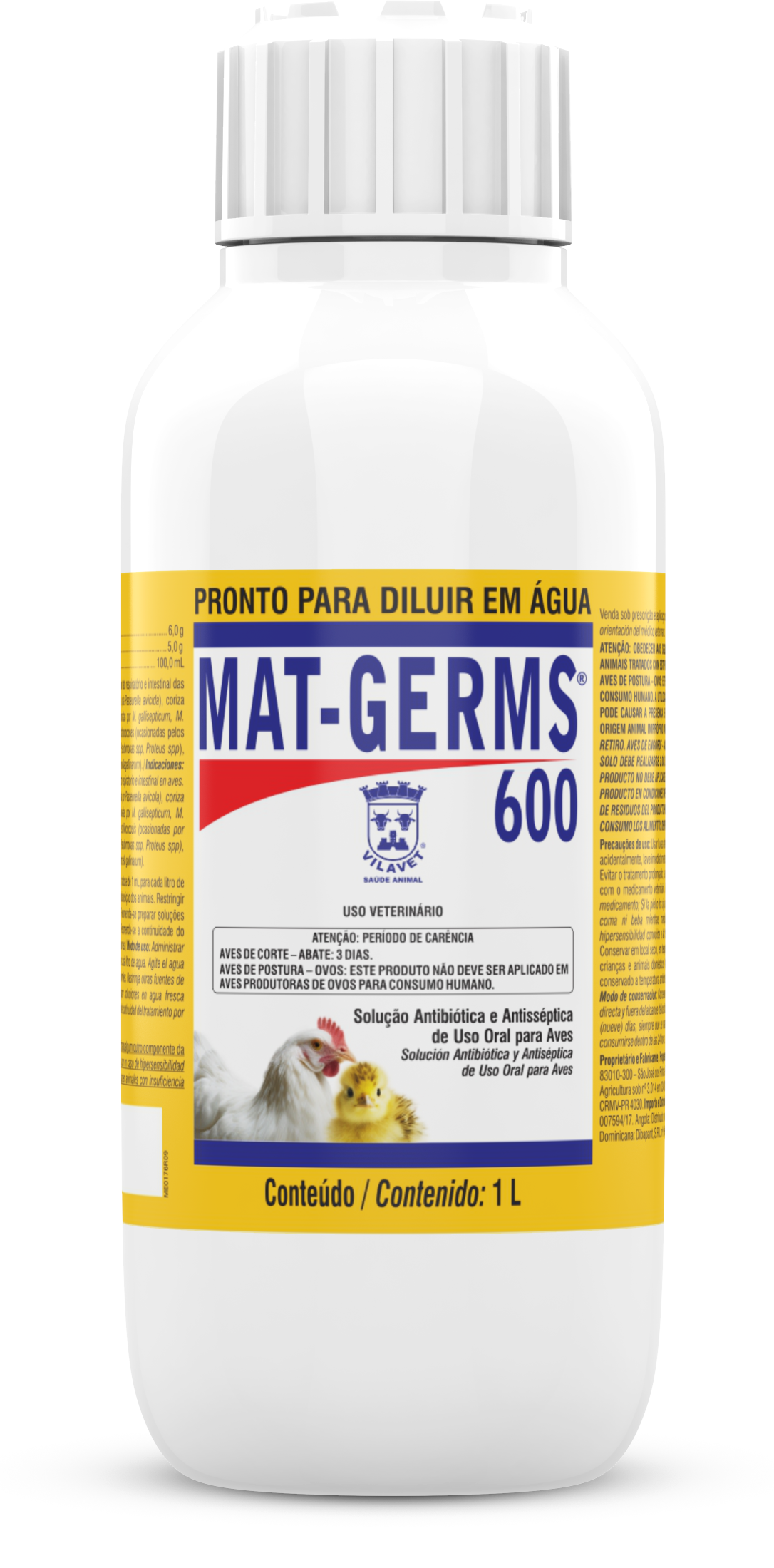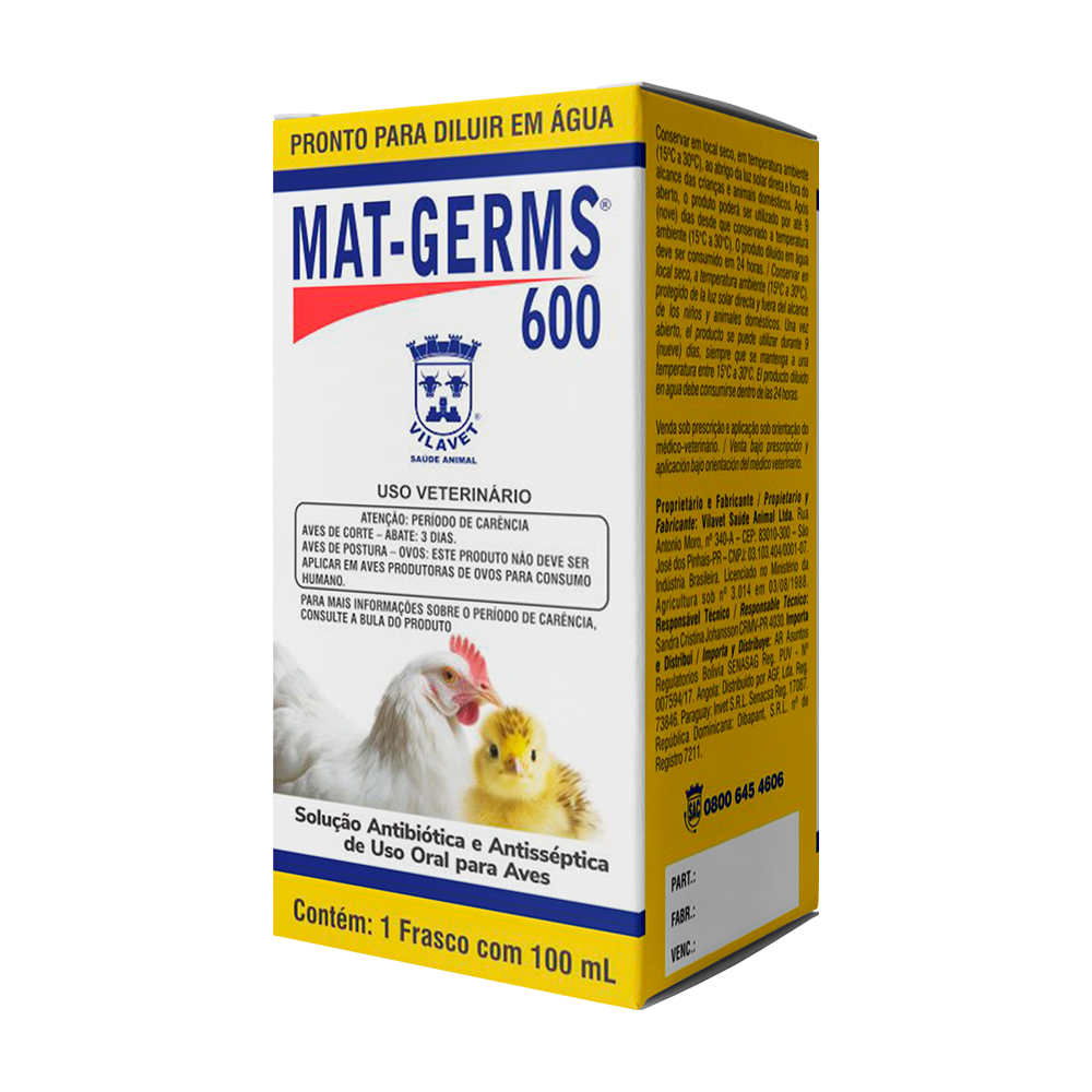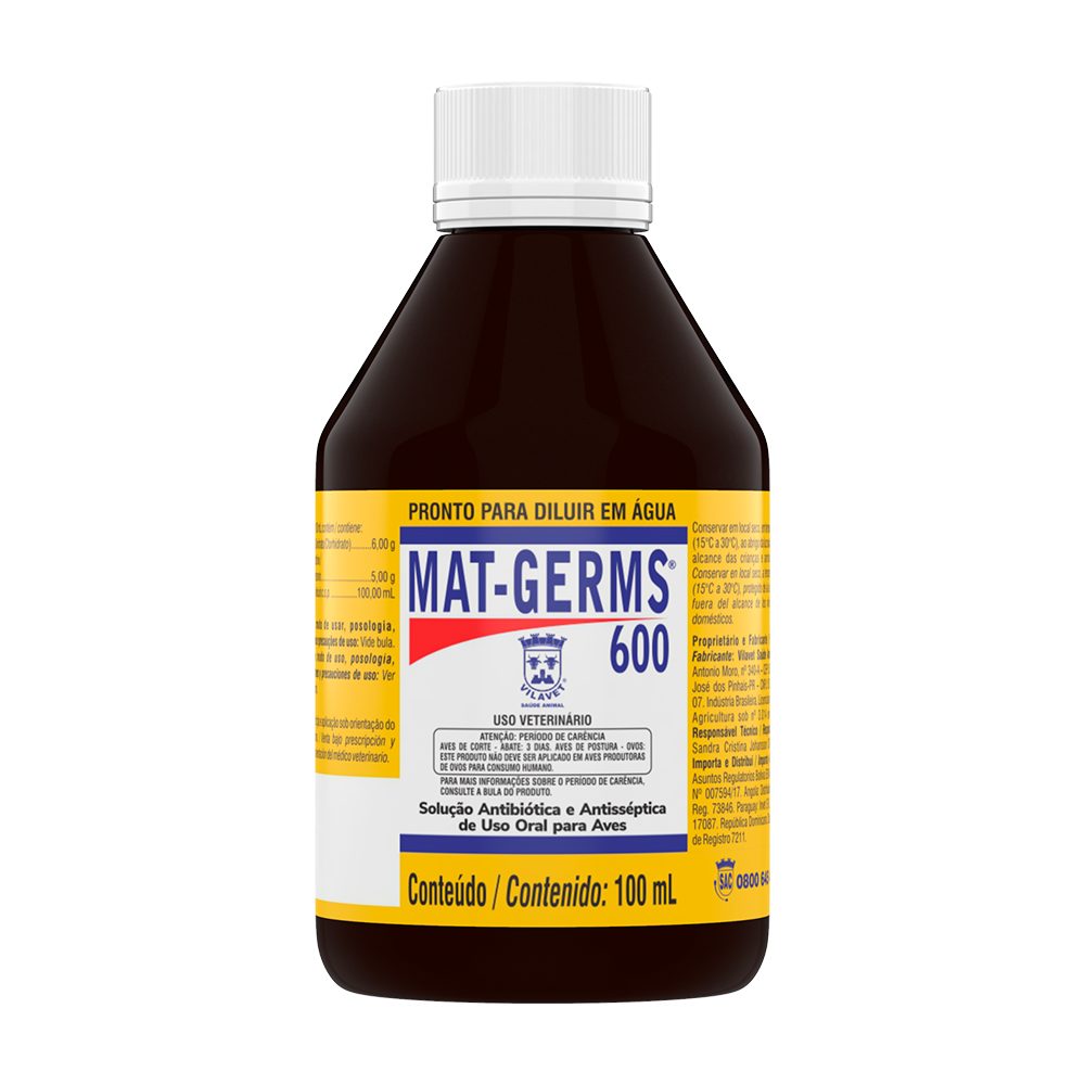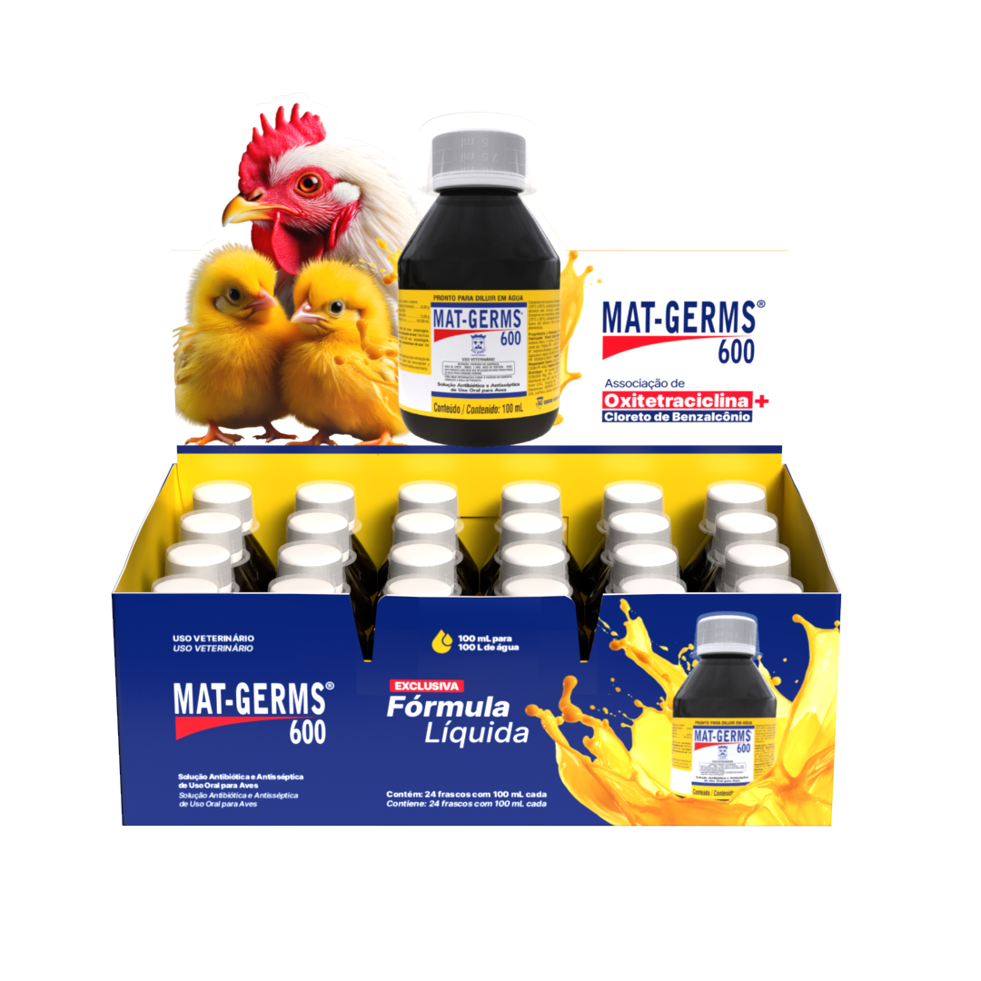 Mat Germs® 600 é indicado no tratamento de infecções em aves causadas pelas bactérias Pasteurella multocida e Avibacterium paragallinarum sensíveis à Oxitetraciclina.